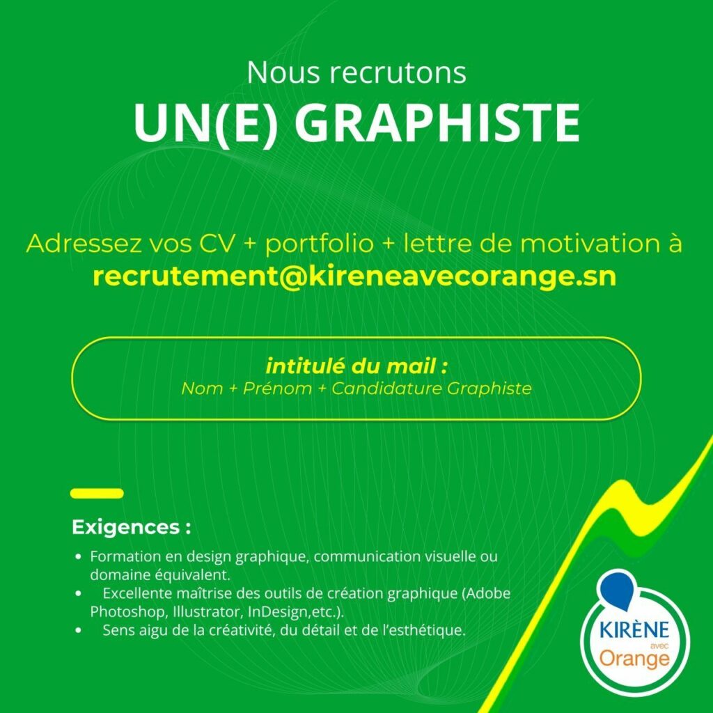 Pour postuler, merci d’envoyer à l’adresse recrutement@kireneavecorange.sn :
